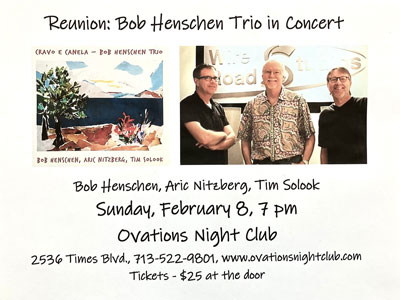 Jazz pianist Bob Henschen recorded a well-received trio CD, Cravo e Canela, back in 2013 with two of Houston's finest jazz players, bassist Aric Nitzberg and drummer Tim Solook. It's been a while since they played a trio performance together, so this event at Ovations is a special reunion concert. They'll be playing tunes by Billy Strayhorn, Michel Legrand, Tex Allen, Jack DeJohnette, Milton Nascimento and more. Should be a great evening!