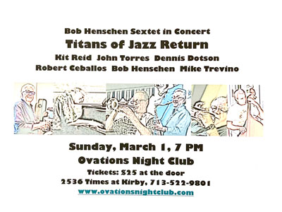 Their debut concert last fall at Ovations was a knock-out. People have been asking for a return engagement. So, the Titans of Jazz - trumpeters Kit Reid and Dennis Dotson, saxophonist John Torres, pianist Bob Henschen, bassist Mike Trevino and drummer Robert Ceballos - some of the best jazz players in the city, will take the stage again for a night of exciting straight ahead jazz. Don't miss it!