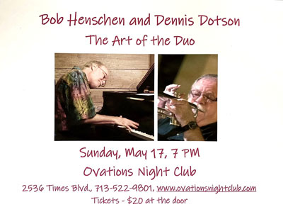 Pianist Bob Henschen and trumpeter Dennis Dotson are two of Houston finest jazz artists. They recently performed a duet during Bob's "Titans of Jazz" sextet concert at Ovations in February and it received so much praise that they've decided to make of evening of it May 17. Performing duo is something they both enjoy - playing off and supporting each other, and taking advantage of the open acoustic space that's available. This is a rare opportunity to hear Dennis and Bob in this setting and it should be a night to remember.